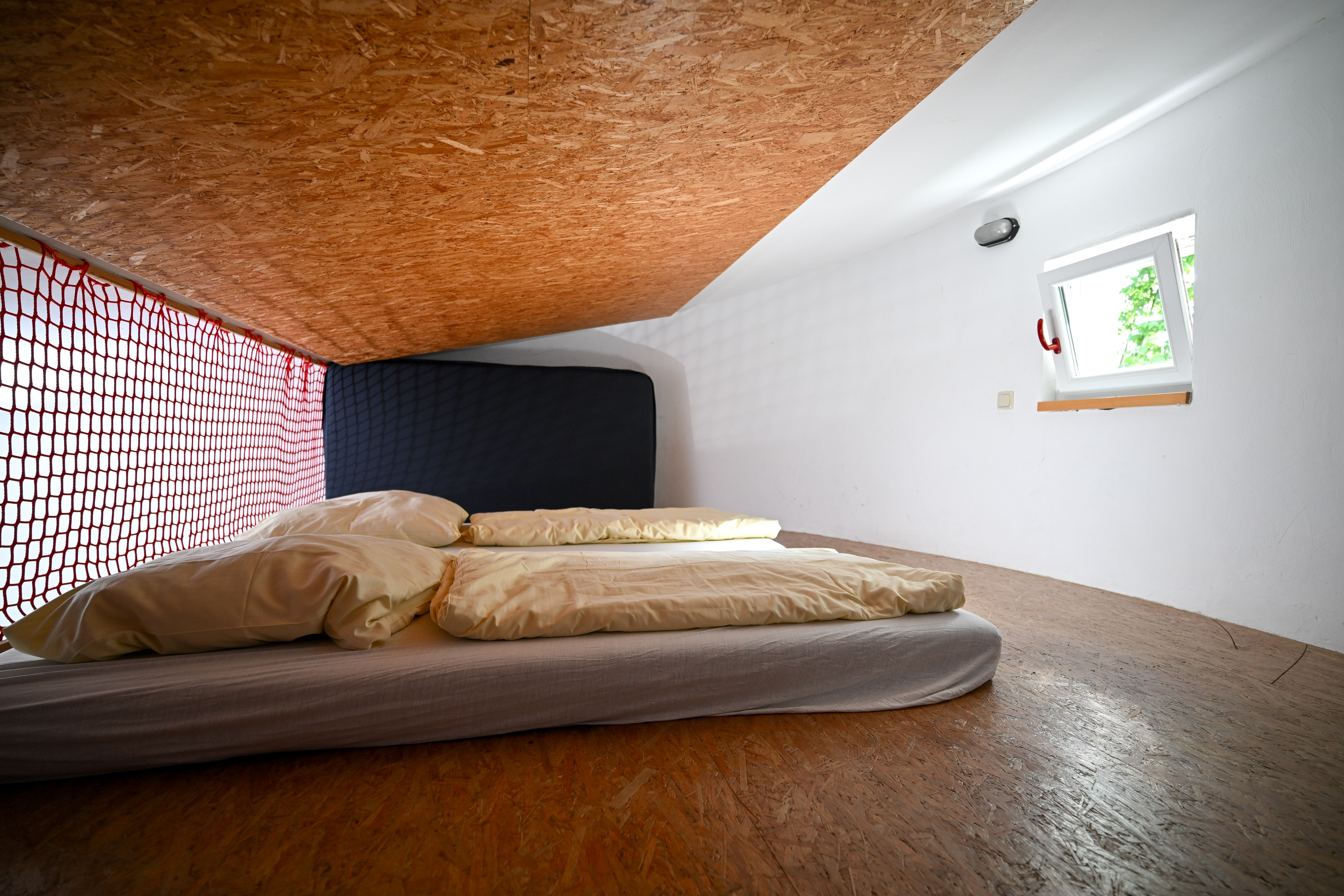 In unseren 14 Kanzelhäusern und 2 Tipis schlaft Ihr in Einzel- und Doppelstockbetten. Highlight ist die Schlafempore mit Matratzenlager. In den meisten Häusern finden bis zu 11 Personen Platz. Insgesamt gibt es 142 Schlafmöglichkeiten im Camp.